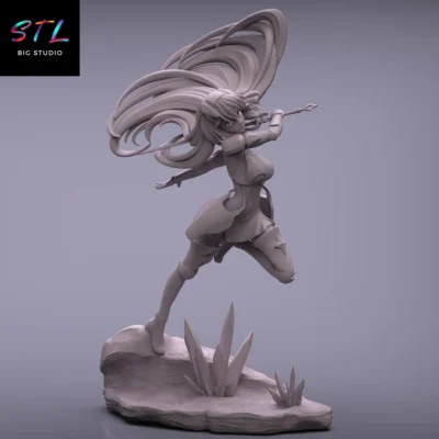 El modelo STL de Ais Wallenstein transmite velocidad, ligereza y control absoluto. La pose en suspensión, con el cabello fluyendo de forma dinámica y el cuerpo proyectado hacia delante, refleja la esencia de Ais: una guerrera fría en apariencia, pero guiada por una determinación inquebrantable. Cada línea del esculpido refuerza su elegancia marcial y su condición de una de las espadachinas más temidas de Orario.