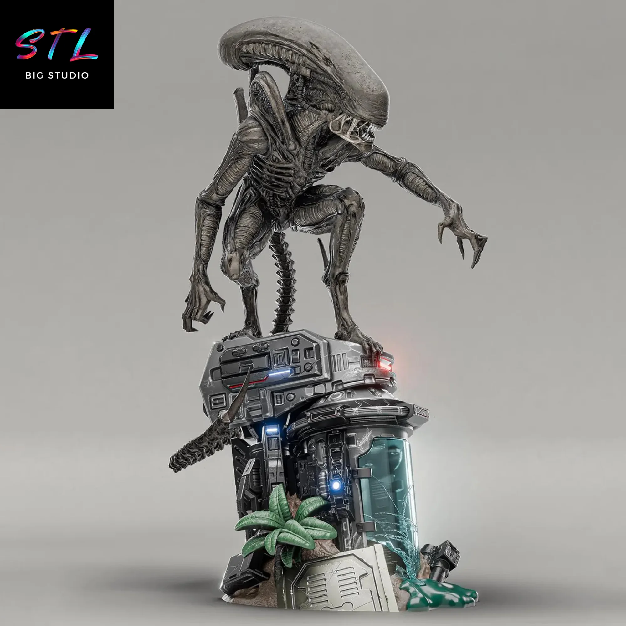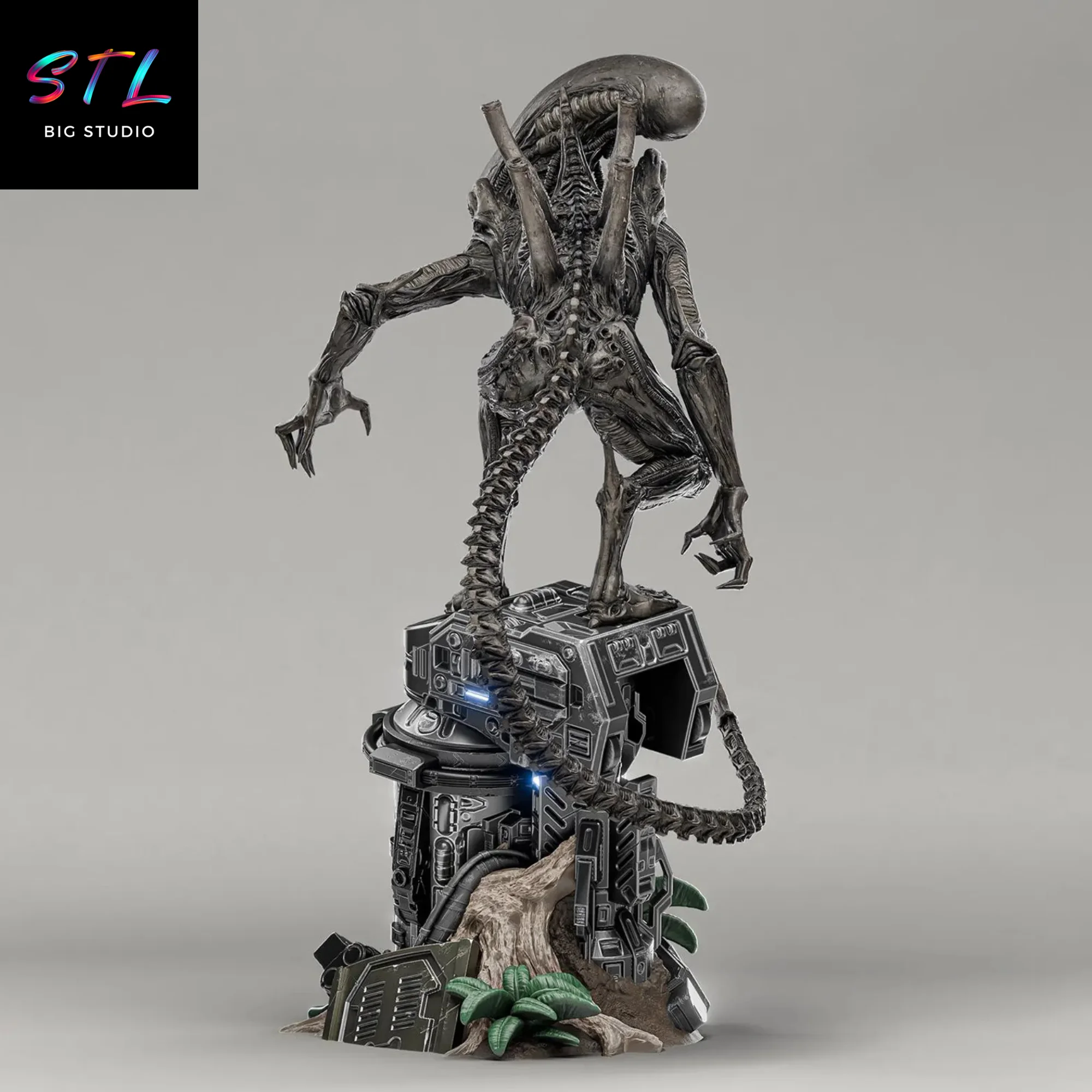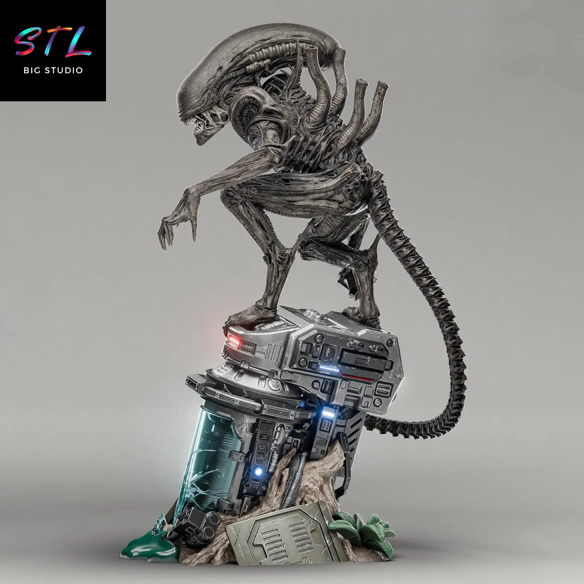 El modelo STL presenta al Xenomorfo en una pose amenazante, agazapado sobre una estructura futurista destruida, como si acabara de escapar de un laboratorio o una colonia espacial infestada. Cada pliegue, tendón, tubo dorsal y textura orgánica reflejan el diseño biomecánico que ha hecho de la criatura una leyenda del terror. Por su parte, la base añade narrativa: cápsulas rotas, luces, vegetación extraterrestre y restos tecnológicos que completan la escena y la elevan a un nivel cinematográfico.