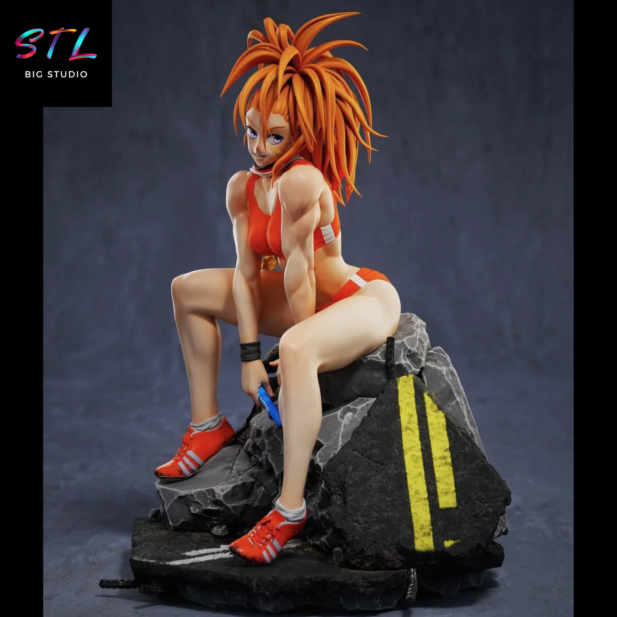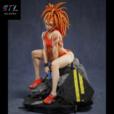 In this Captain Mizuki STL figure for 3D printing, the design focuses on a dynamic and highly expressive scene. The heroine appears seated on a block of broken rock and cracked asphalt, as if she has just finished an intense battle or training session. Her relaxed yet confident posture conveys self-assurance, while her challenging expression reflects the strong and competitive personality that defines her.