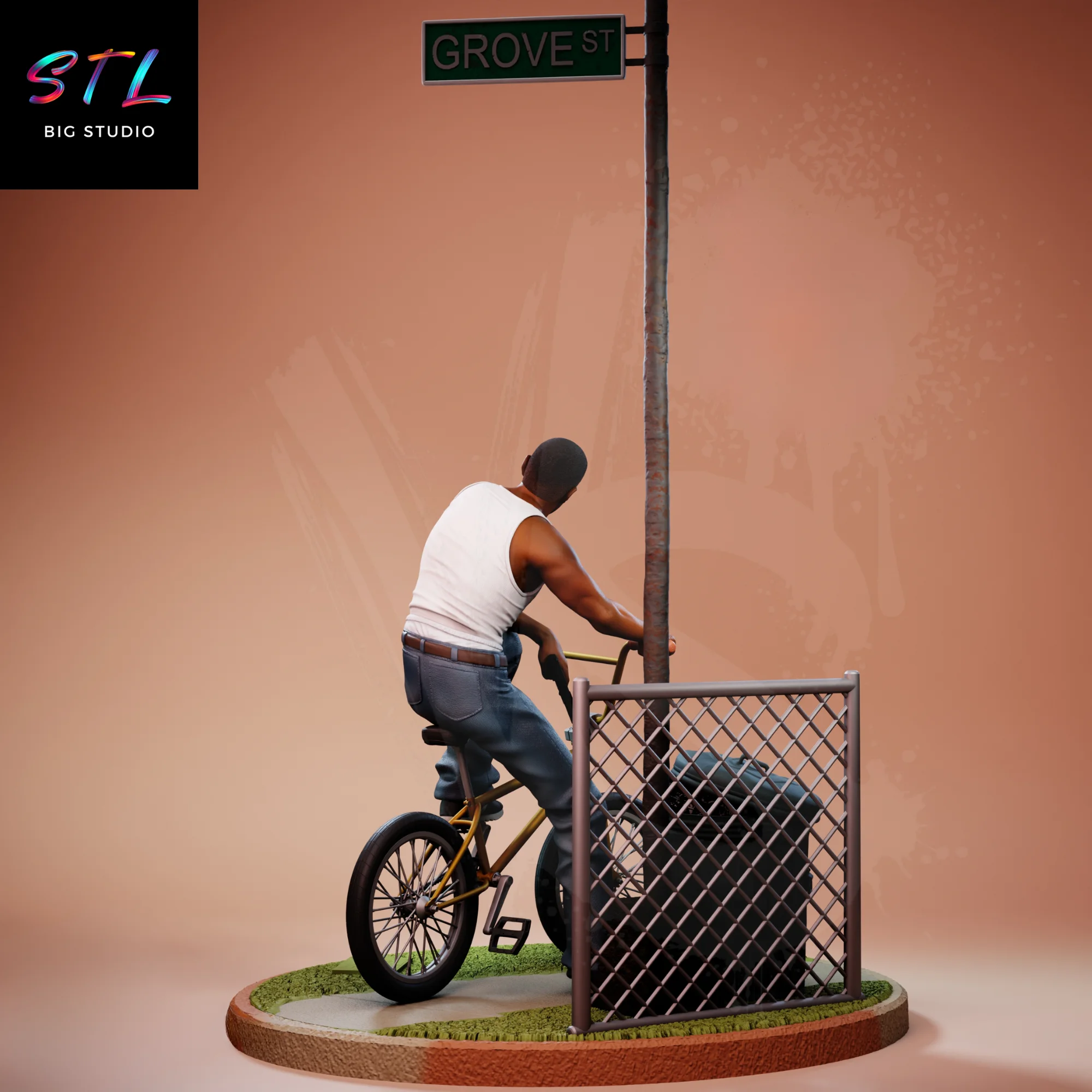 Gamer nostalgia comes to life with this stunning CJ Grove Street STL figure, inspired by Grand Theft Auto: San Andreas. This 3D model recreates one of the game’s most legendary moments — CJ on his bike at the corner of Grove Street — bringing to life the iconic line: “Ah, shit, here we go again.”