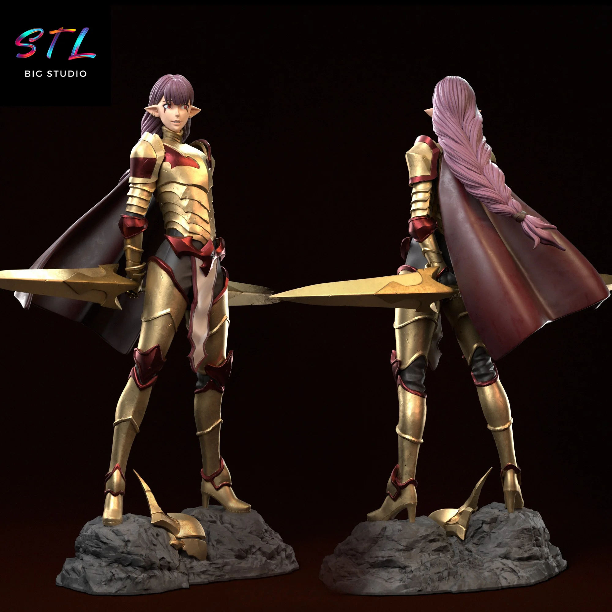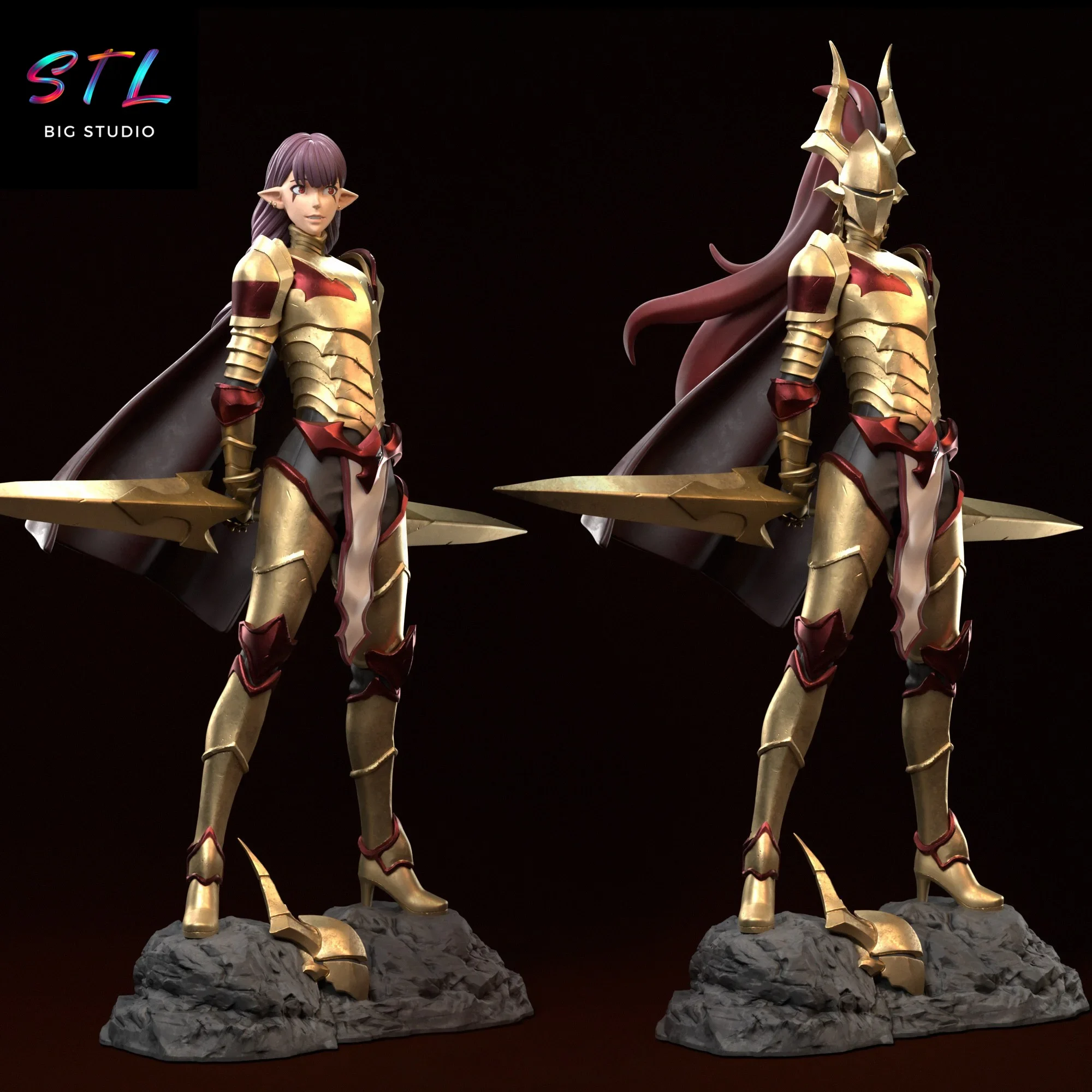 One of the great highlights of this Esil Radiru STL is the option to display her with or without the helmet, allowing you to choose between a more intimidating version or a more expressive one. The rocky base adds visual stability and reinforces the sense of a dominant character, ready to take a leading role in any Solo Leveling–inspired 3D collection.