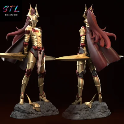 The 3D figure shows Esil wearing her imposing golden and crimson armor, sword in hand and cape flowing naturally, conveying authority and absolute confidence. The STL design stands out for its firm and elegant posture, created to reflect her status within the demon world without the need for exaggeration.