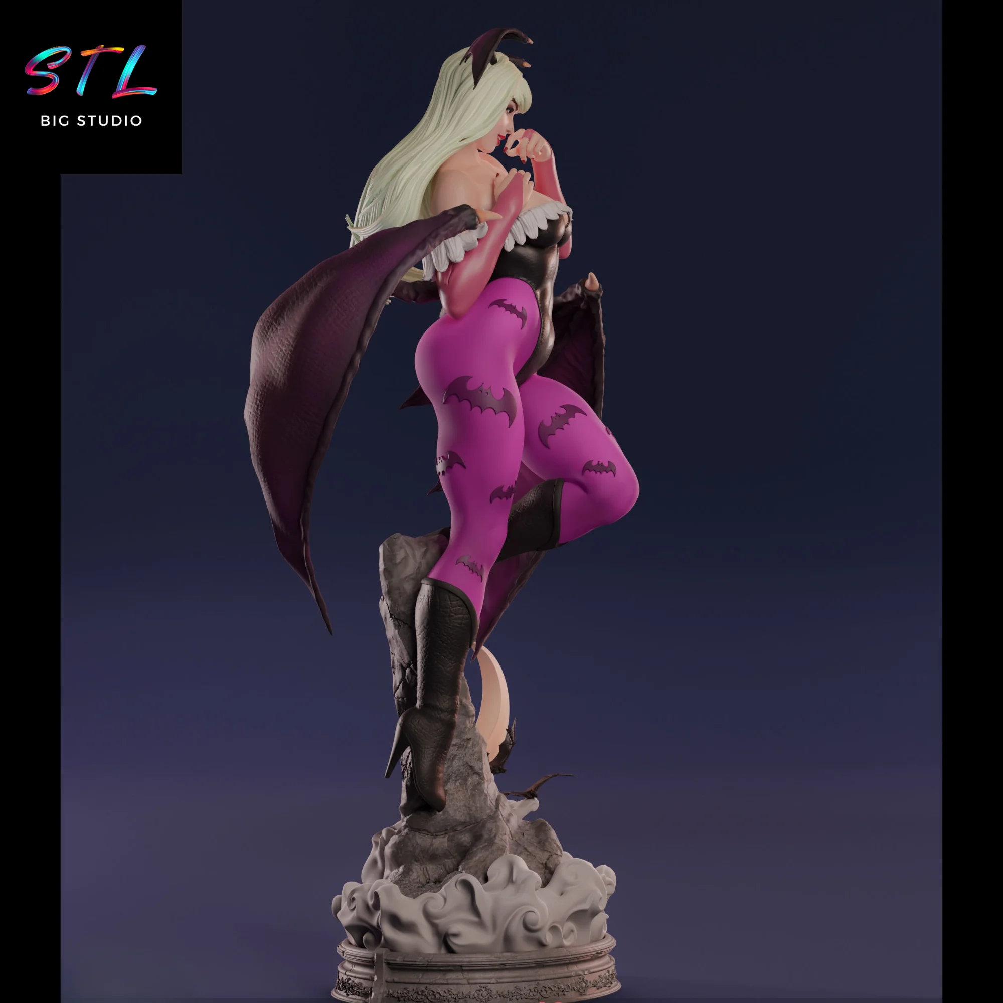 The STL figure depicts Morrigan in an elevated stance atop a base sculpted with clouds and a crescent moon, reinforcing her supernatural aura. Her wings spread wide, flowing hair, and the tight design of her outfit create a dynamic silhouette that is instantly recognizable. Every detail — from the secondary wings on her head to her playful and dominant expression — is crafted to stand out in 3D printing, whether in resin or high-precision FDM.