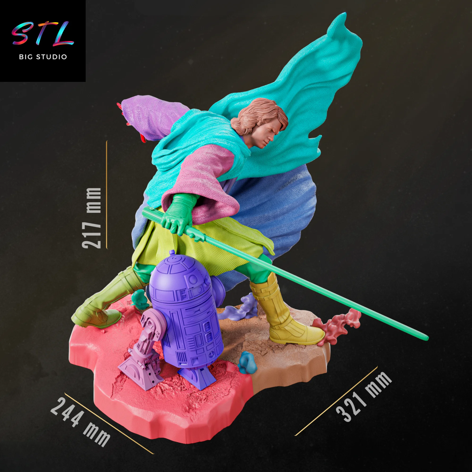Relive one of the most iconic moments in Star Wars with this stunning Anakin Skywalker STL figure, accompanied by his loyal droid R2-D2. This dynamic 3D diorama captures the young Jedi as he wields his blue lightsaber with fierce determination, his cape flowing in the wind beside his trusty astromech companion.