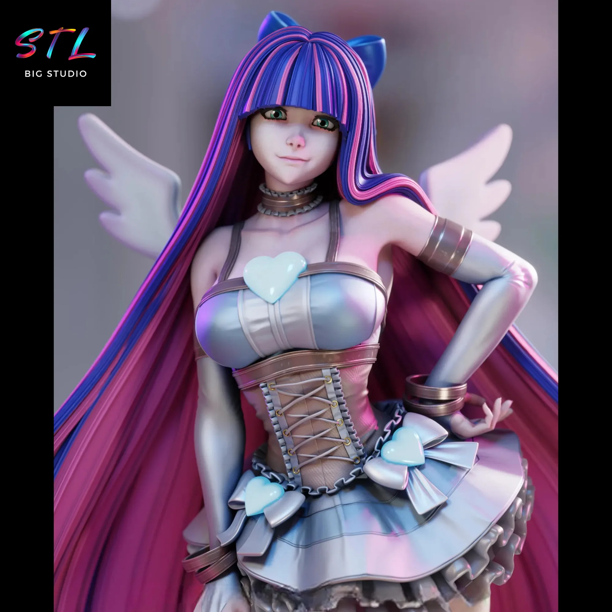 This 3D model presents Stocking in a confident and dominant pose, with her iconic long hair, stylized wings, and a detailed outfit that faithfully respects the animeβs design. The composition conveys apparent calm and superiority, reinforced by the relaxed posture, restrained expression, and the balance between soft curves and sharp lines.