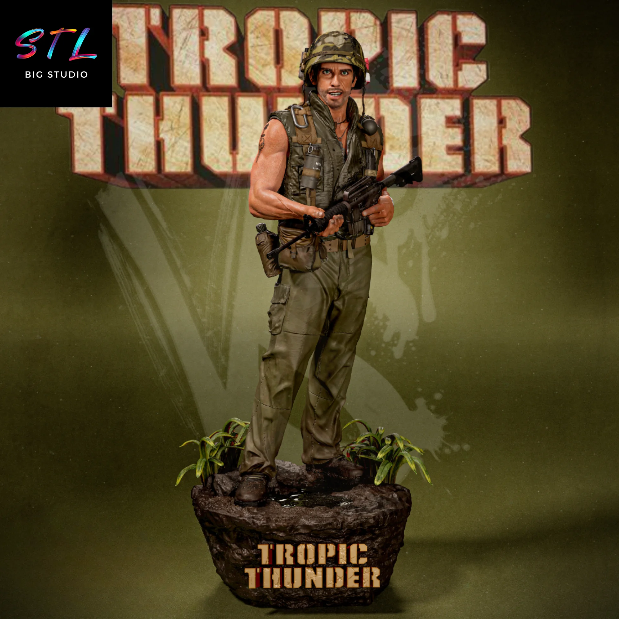 This Tugg Speedman STL for 3D printing portrays the actor transformed into an “action hero” in the middle of the jungle film set. With a rifle in his hands, military uniform, and determined expression, the figure perfectly conveys the aesthetic of Hollywood war movies… even though, in this case, everything is part of a satire of the film industry itself.