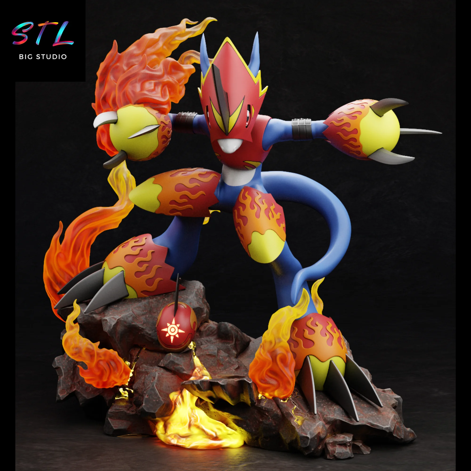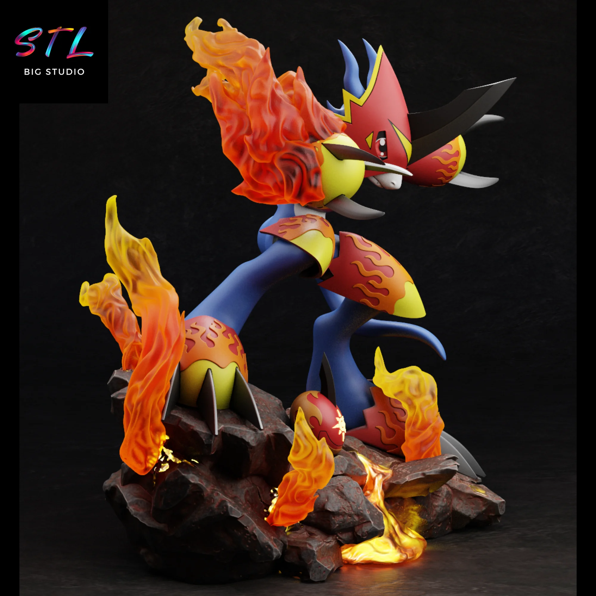 El diseño STL está cargado de dinamismo: las llamas envuelven brazos y piernas mientras Flamedramon se impulsa sobre una base rocosa ardiente, como si acabara de entrar en combate. Cada elemento refuerza su identidad como guerrero veloz y feroz, con un equilibrio muy cuidado entre estilo anime y volumen tridimensional.