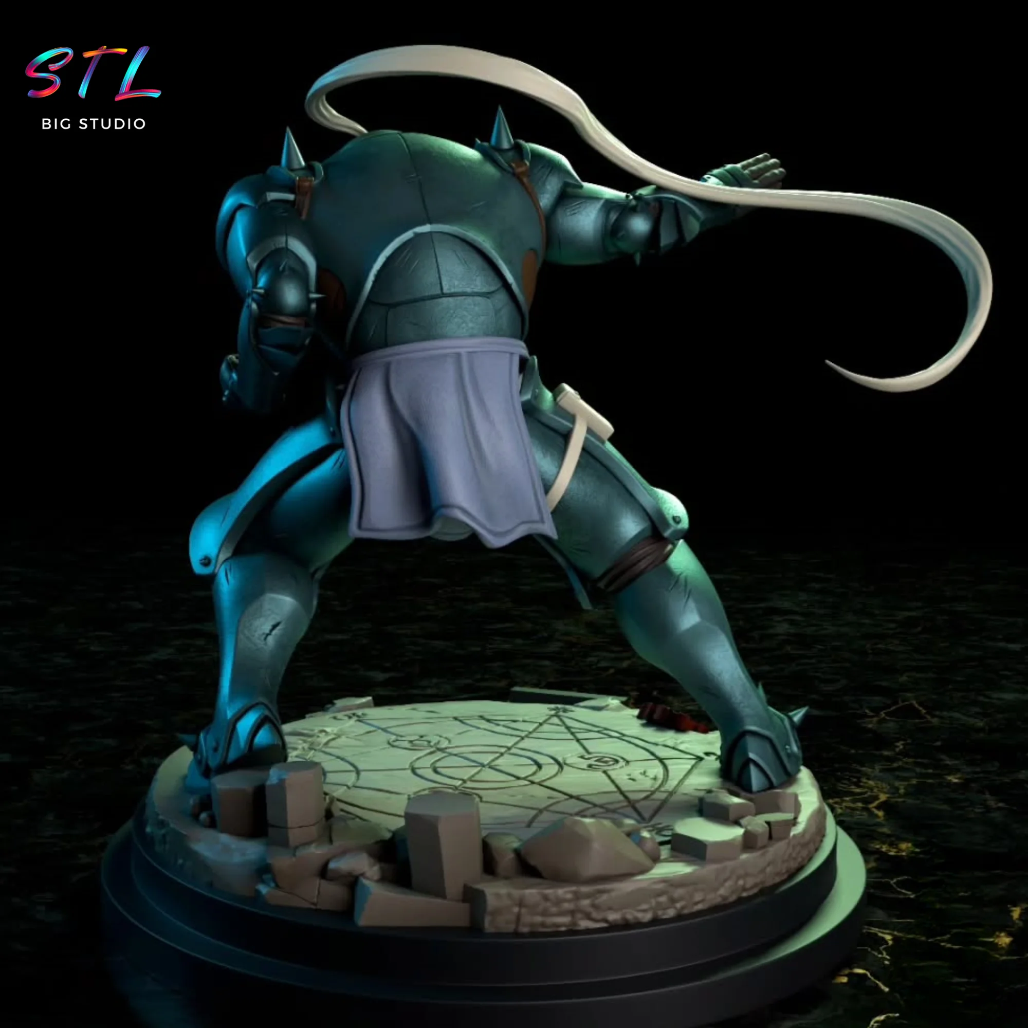 La base refuerza el carácter alquímico de la escena, incorporando símbolos grabados y elementos fragmentados que evocan los círculos de transmutación y el caos controlado de la alquimia. Este STL de Alphonse Elric no es solo una figura para imprimir en 3D, es un homenaje visual a la lealtad, la inocencia y el sacrificio que marcaron su historia.