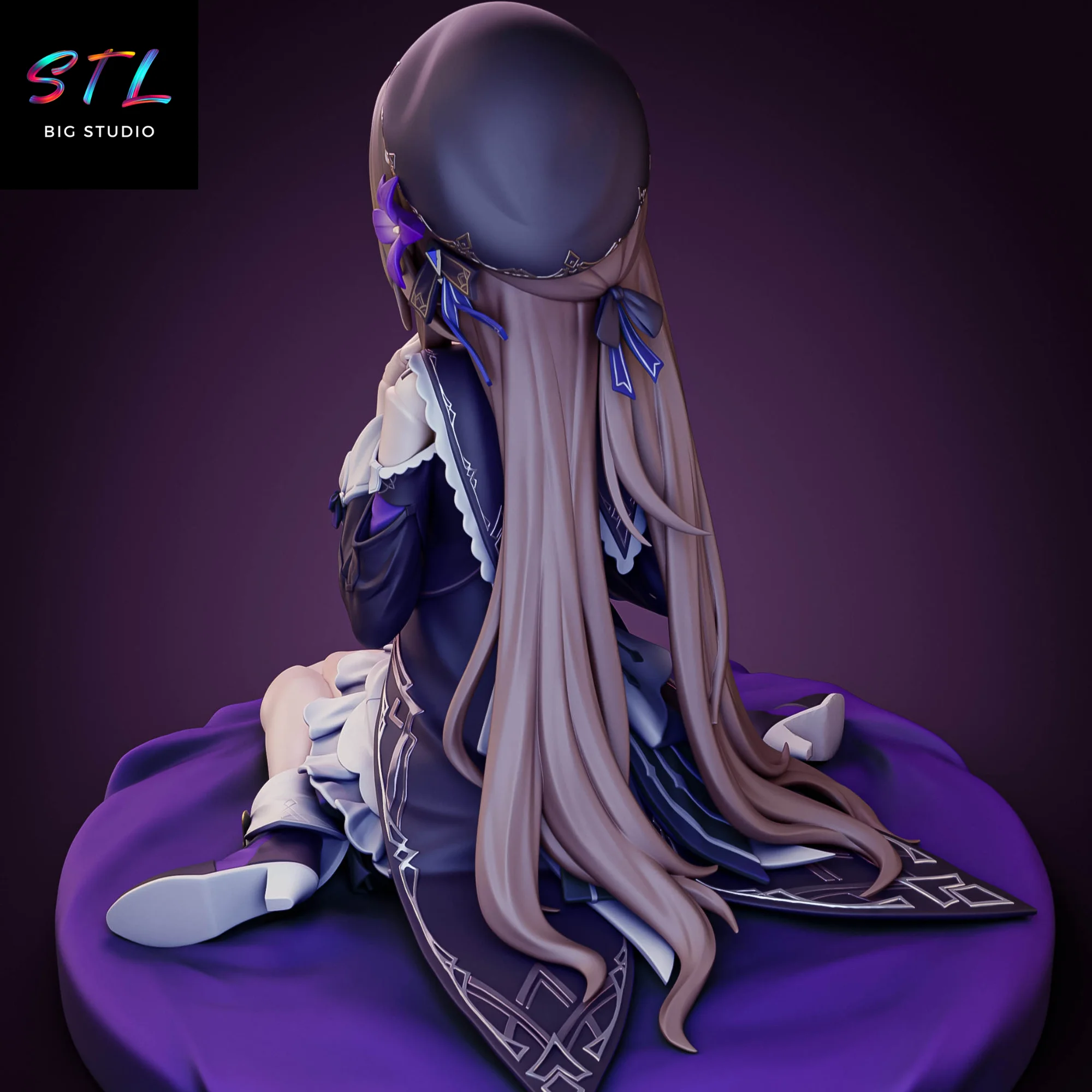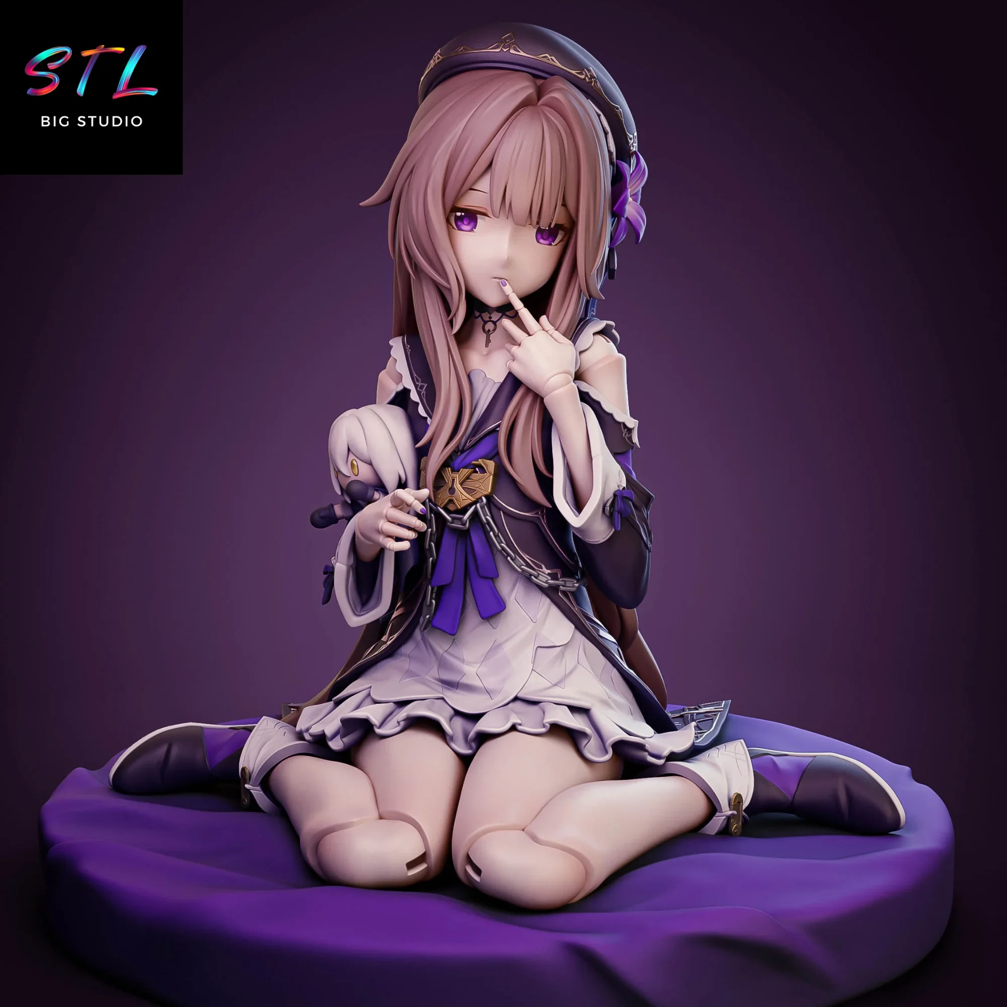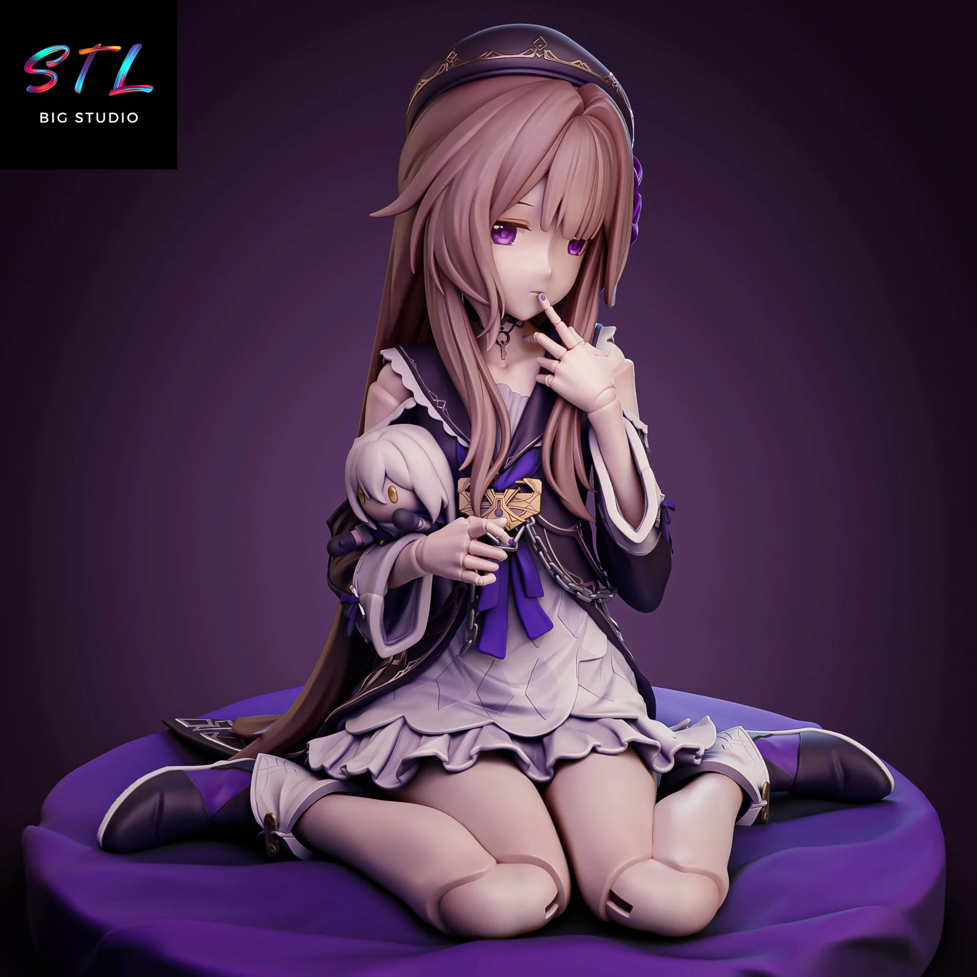 La figura 3D muestra a Herta en una pose delicada sobre un cojín circular, acompañada de su inseparable marioneta, reforzando esa dualidad entre genialidad científica y aire juguetón. El modelado STL destaca cada detalle de su vestimenta: los pliegues del vestido en tonos púrpura, los adornos dorados, las cadenas ornamentales y el trabajo minucioso del cabello largo que cae con suavidad por su espalda.