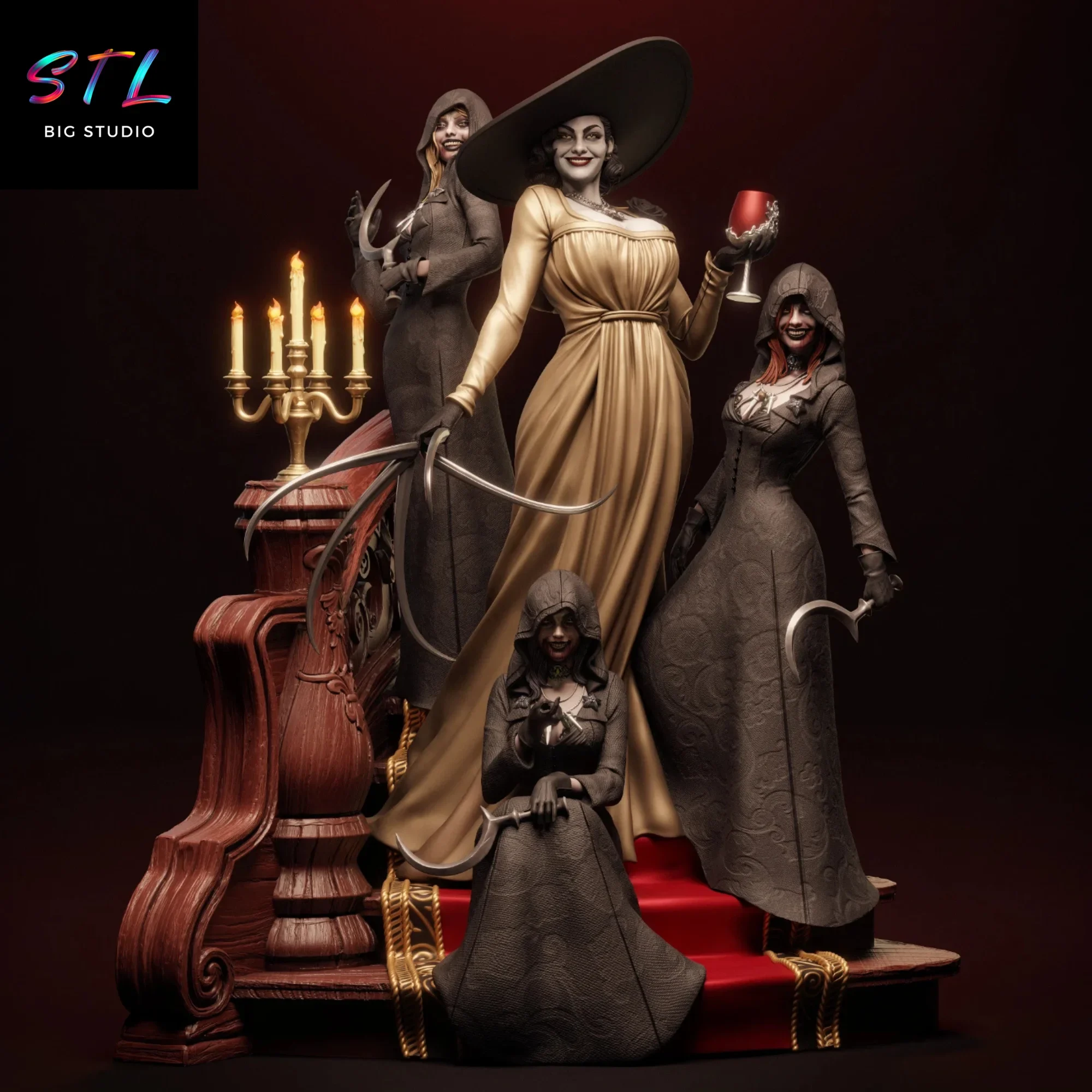 La figura 3D representa a Alcina Dimitrescu en una composición majestuosa y teatral, rodeada por sus hijas vampíricas, recreando una escena que transmite poder, decadencia aristocrática y horror clásico. El modelado STL enfatiza su silueta estilizada, el vestido largo característico, el sombrero de ala ancha y las icónicas garras, mientras que las doncellas refuerzan la narrativa oscura del castillo Dimitrescu con poses expresivas y detalles siniestros.