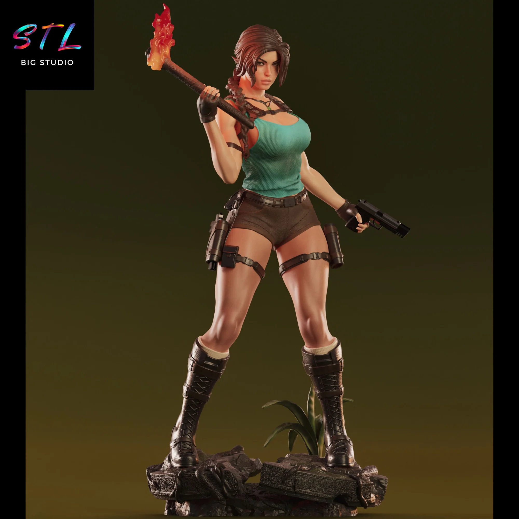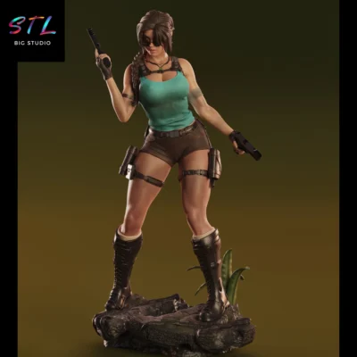 La figura STL representa a Lara Croft en una pose dominante sobre una base rocosa, con sus icónicas pistolas empuñadas y su inconfundible outfit verde y marrón. La expresión facial transmite concentración y carácter, mientras que la postura firme y equilibrada refuerza esa sensación de seguridad y experiencia que define a la protagonista de Tomb Raider.