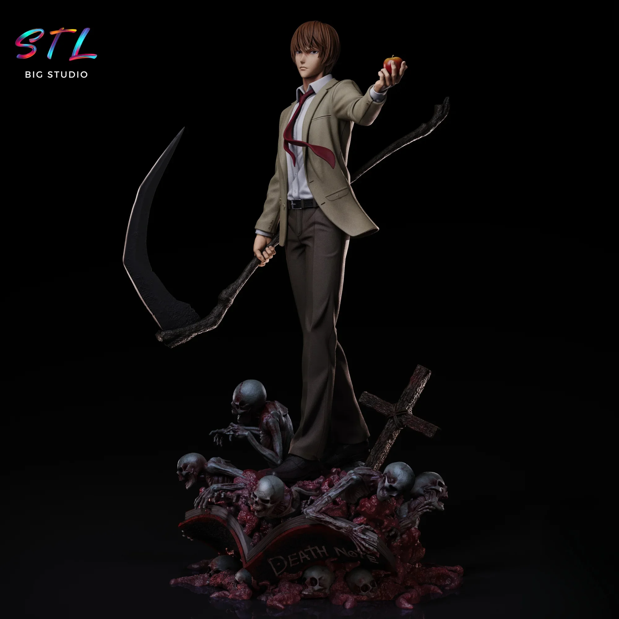 El modelo STL muestra a Light de pie, sosteniendo una manzana y una guadaña, símbolo de poder y destino, sobre una base formada por el Death Note abierto y almas atormentadas emergiendo de sus páginas. Los detalles anatómicos, el movimiento natural del traje y la expresión fría y calculadora del rostro transmiten toda la esencia del personaje.