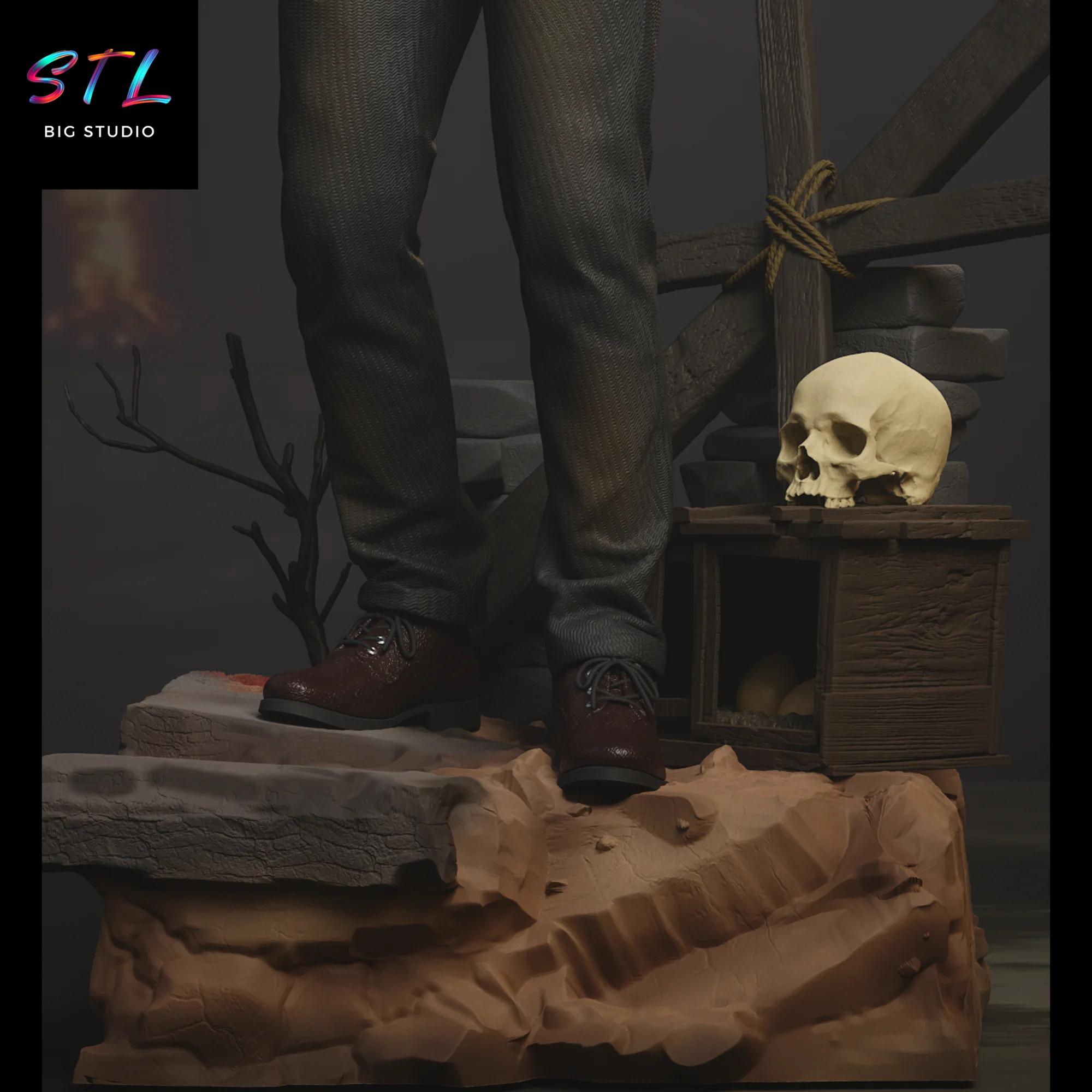 El diorama refuerza el tono oscuro y dramático del personaje, con una base ambientada que incluye elementos deteriorados, madera rota, piedras y detalles simbólicos que encajan perfectamente con el entorno opresivo del juego. Este archivo STL está pensado para quienes buscan una pieza con presencia, ideal para colecciones de survival horror o figuras 3D con historia y personalidad propia.