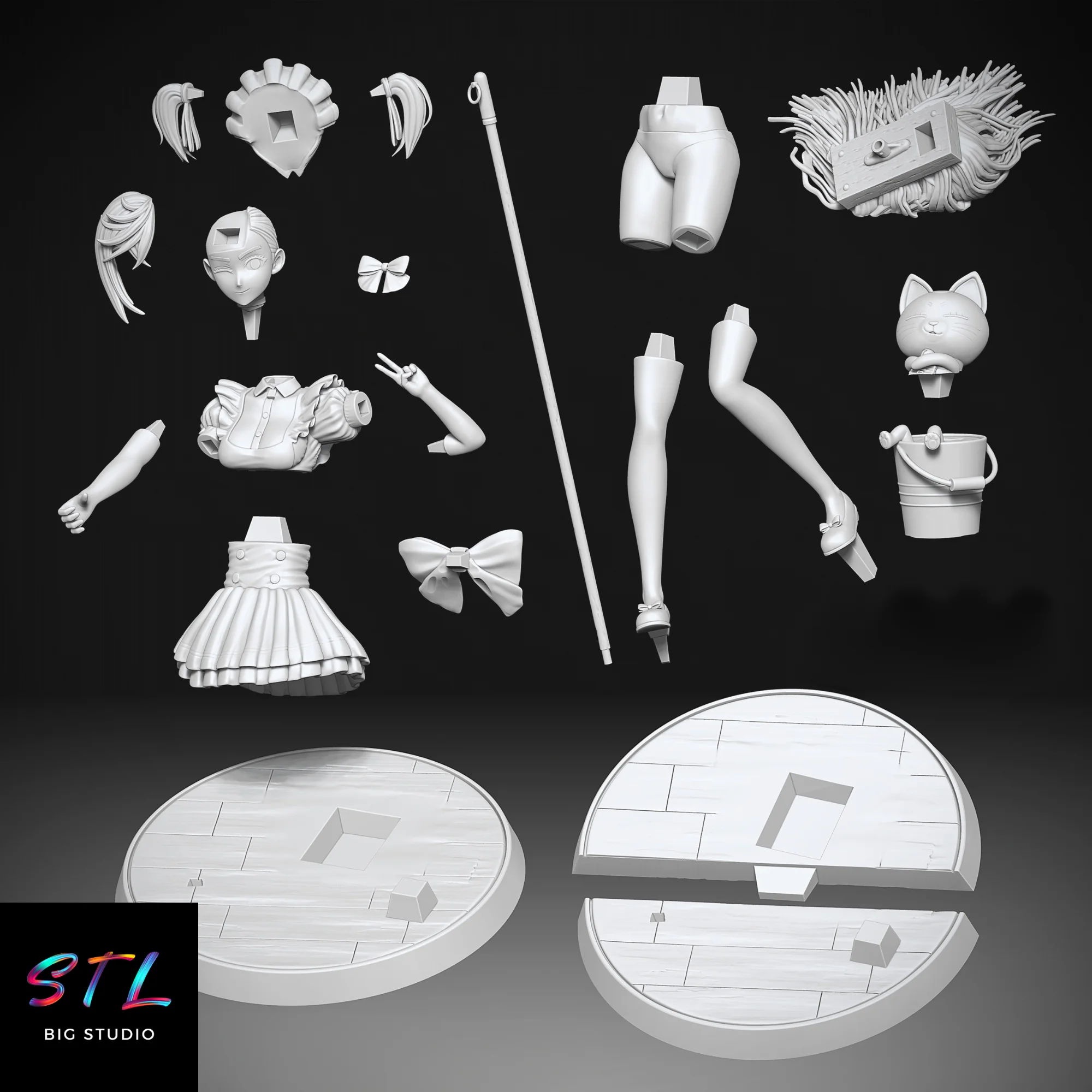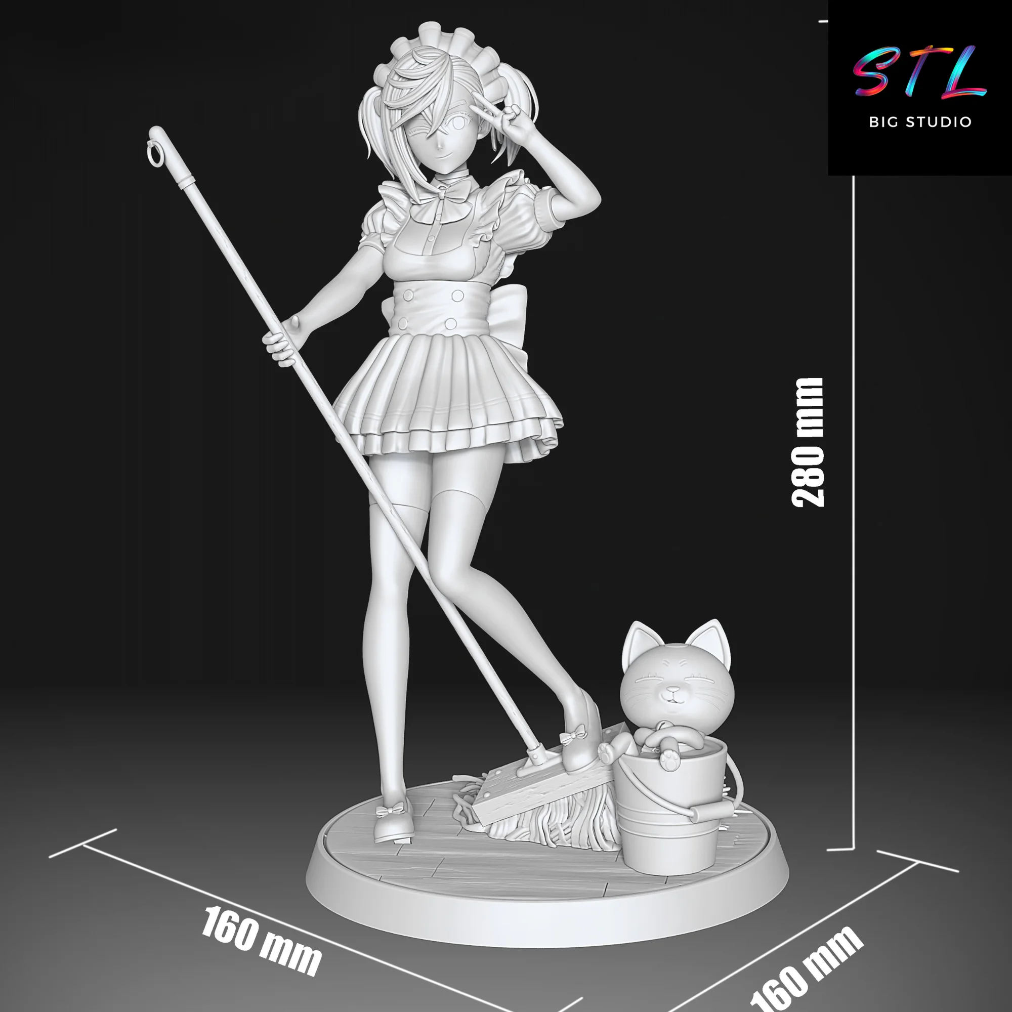Momo posa con una sonrisa traviesa y gesto de victoria, sosteniendo una escoba mientras un simpático gato observa desde un cubo. Su atuendo de sirvienta combina elegancia y dinamismo: el vestido con volantes, el lazo trasero y los pliegues del delantal muestran un trabajo de modelado minucioso que resalta la calidad del conjunto.