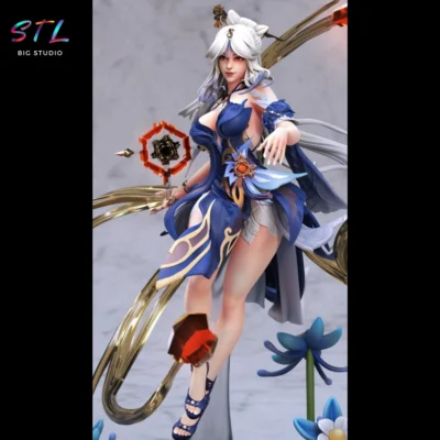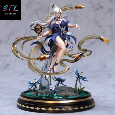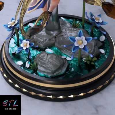 El diseño STL muestra a Ningguang suspendida sobre una base cristalina decorada con flores azules y rocas húmedas, como si estuviera canalizando la energía Geo en plena acción. Su vestido azul profundo, lleno de pliegues dinámicos y ornamentos dorados, se abre con movimientos fluidos que simulan un viento mágico a su alrededor. Cada detalle del atuendo —desde las texturas del corsé hasta los adornos metálicos— está esculpido con precisión para que tu impresión 3D luzca impecable.