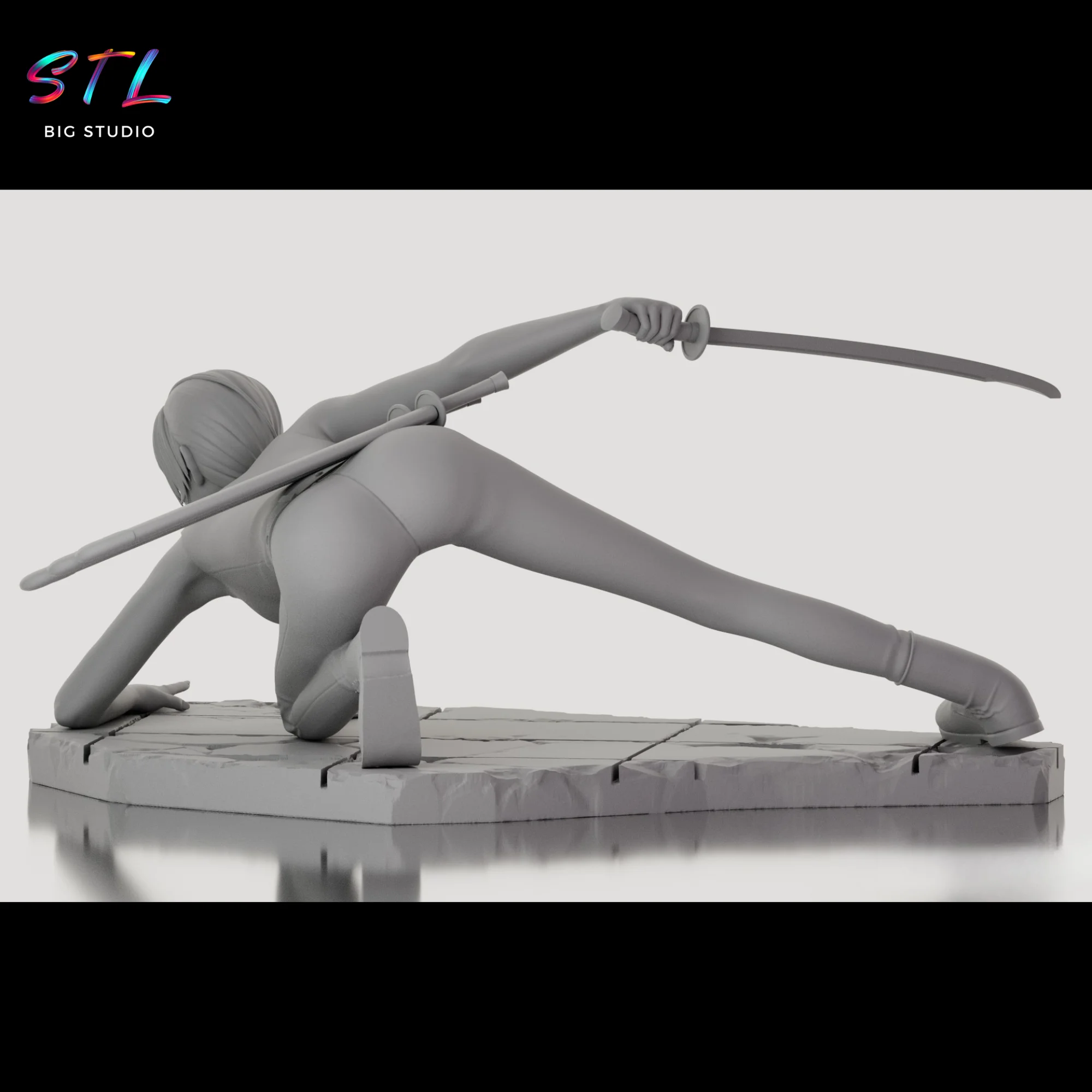 El diseño STL del modelo recrea con gran fidelidad su aspecto característico: cabello corto con mechones largos, expresión fría y concentrada, ropa ajustada de combate y botas tácticas. La escena se completa con una base de suelo fracturado que aporta dramatismo y sensación de impacto, haciendo que la figura 3D tenga una presencia muy potente una vez impresa.