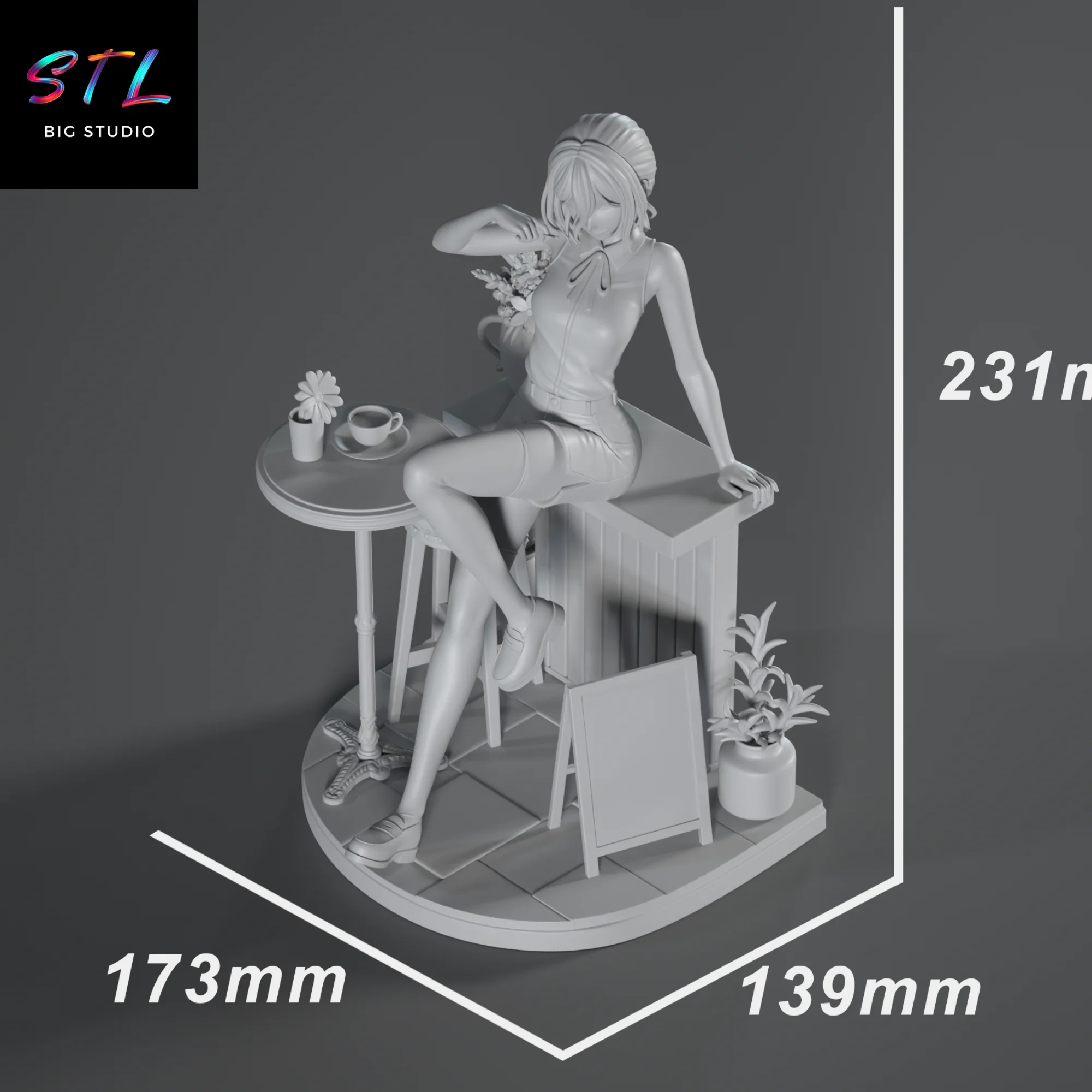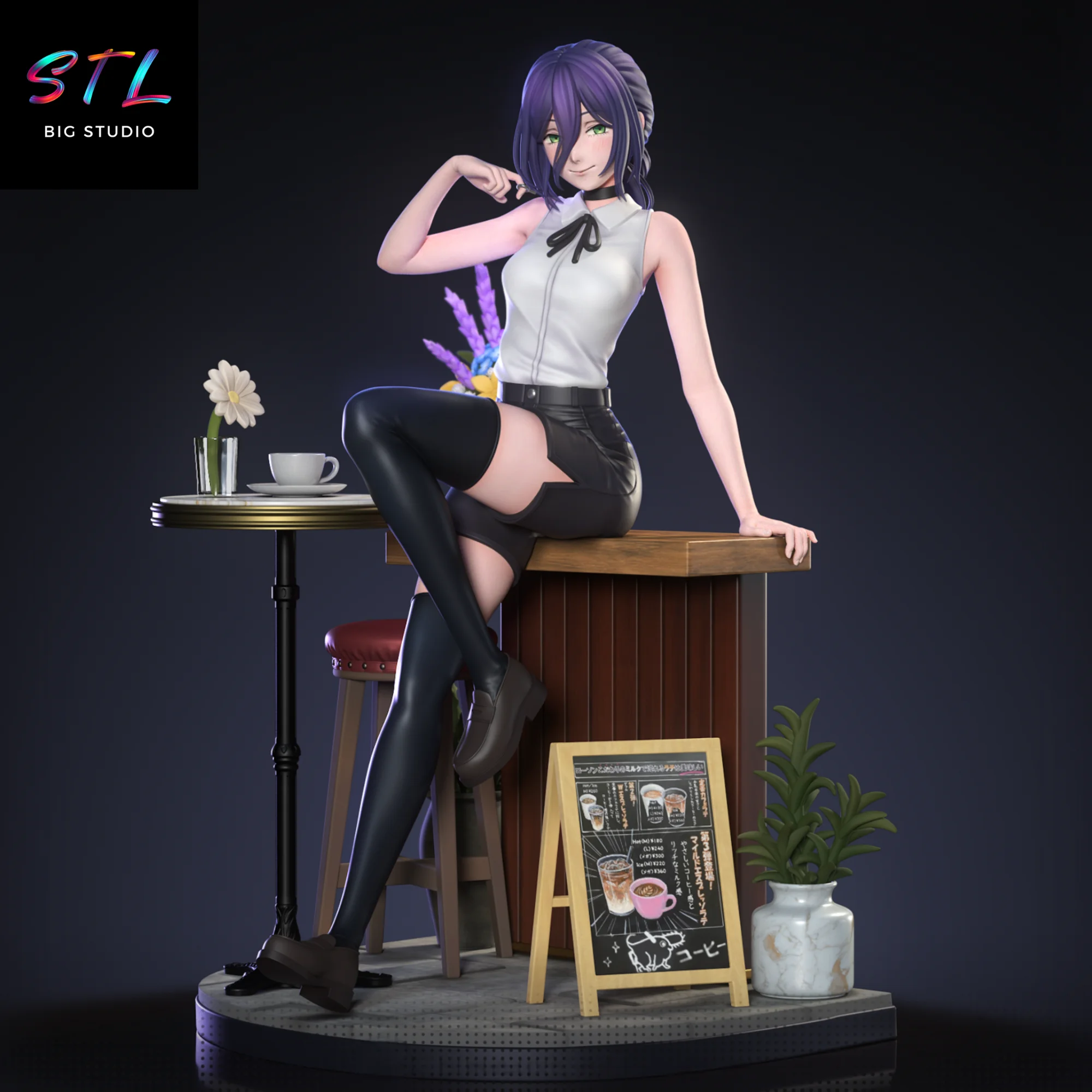 La figura 3D muestra a Reze en un entorno completamente distinto al combate: una cafetería íntima y acogedora, donde cada elemento —la mesa, las flores, el cartel, los pequeños detalles del ambiente— construye una narrativa visual muy potente. Su postura relajada, sentada con elegancia y una ligera sonrisa, refleja ese lado cercano y humano del personaje, mientras su mirada sugiere que hay mucho más bajo la superficie. El contraste entre lo cotidiano y lo inquietante es precisamente lo que hace que esta pieza destaque dentro de cualquier colección anime.