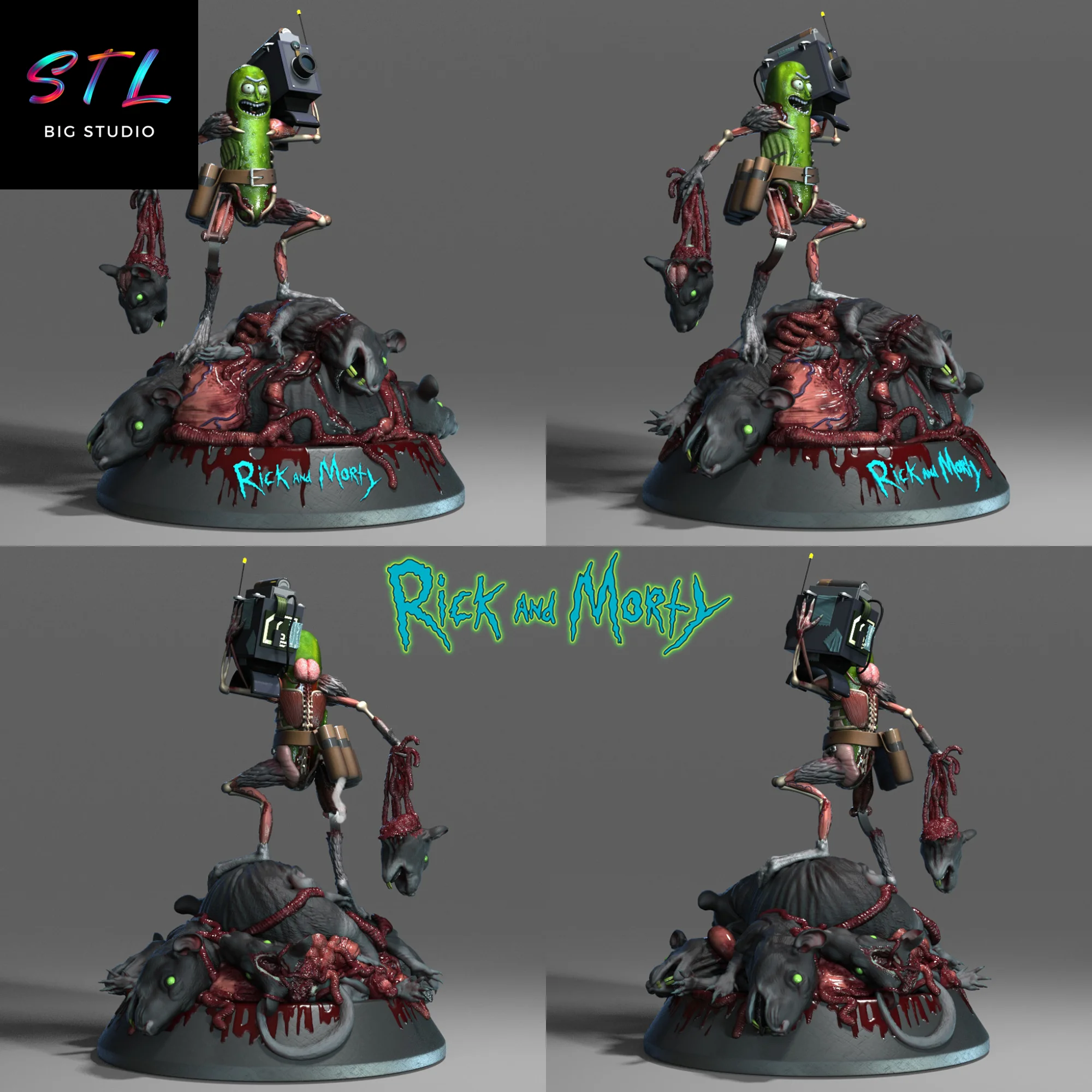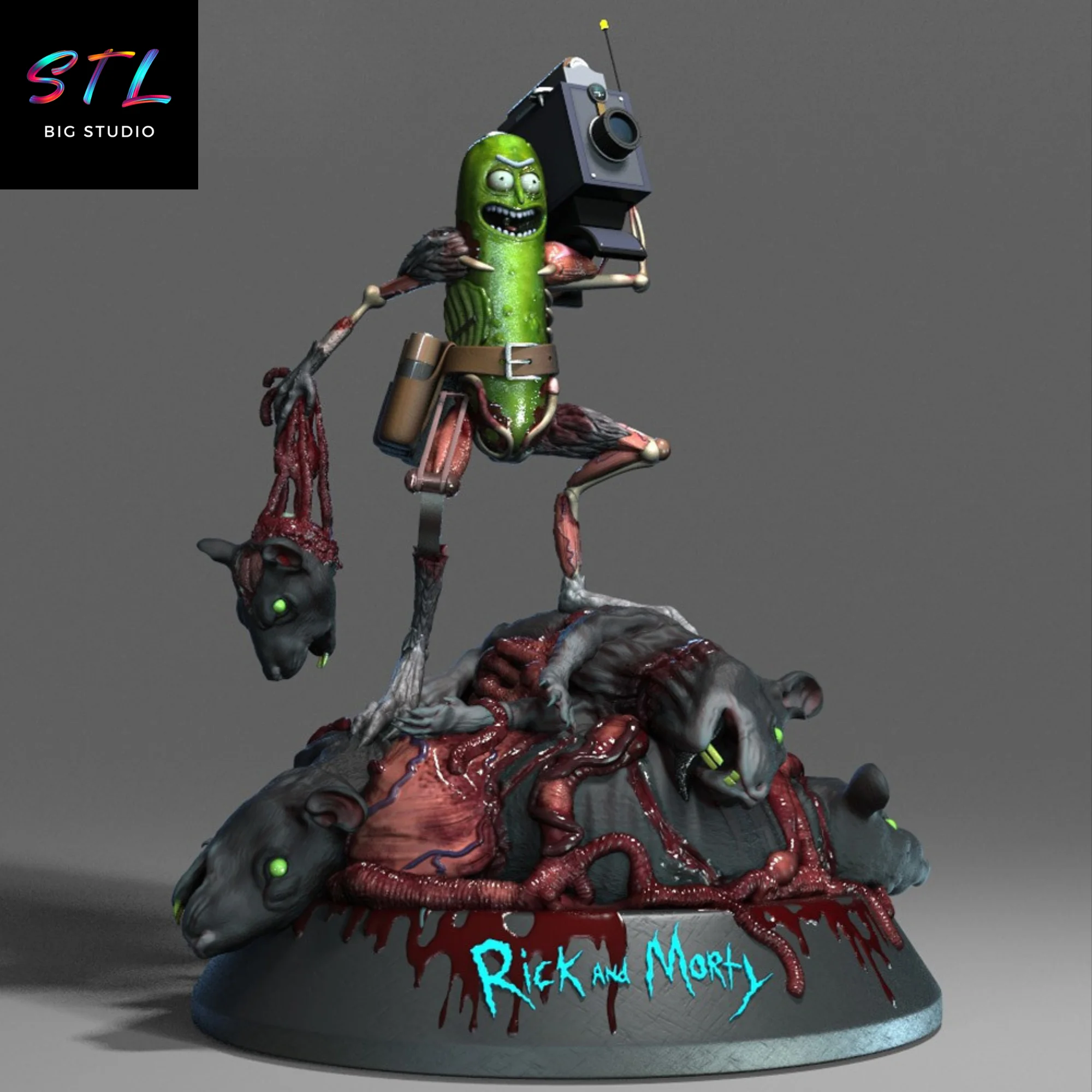El nivel de detalle de esta figura 3D es sencillamente espectacular: el brillo del pepinillo, los implantes mecánicos improvisados con partes de ratas, y la expresión de locura absoluta que solo Rick puede tener. Todo el diseño transmite acción, ingenio y el humor negro característico de la serie Rick y Morty.
