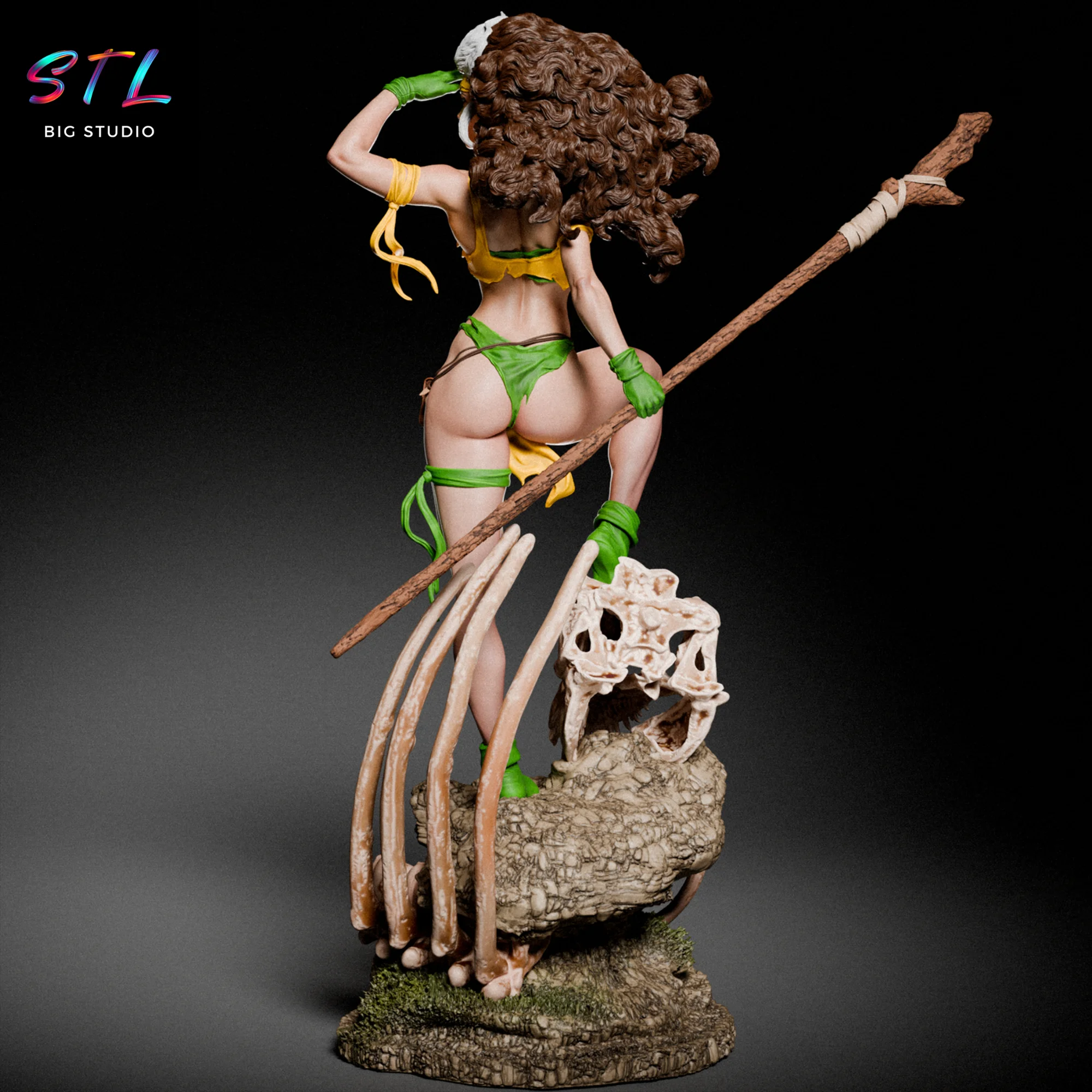 La escultura 3D destaca especialmente por el impresionante movimiento del cabello, uno de los rasgos más característicos de Rogue, con su icónico mechón blanco contrastando con el resto de su melena. La composición se completa con una base escénica formada por restos fósiles y el cráneo de una criatura prehistórica, creando una escena que transmite supervivencia, fuerza y espíritu indomable.