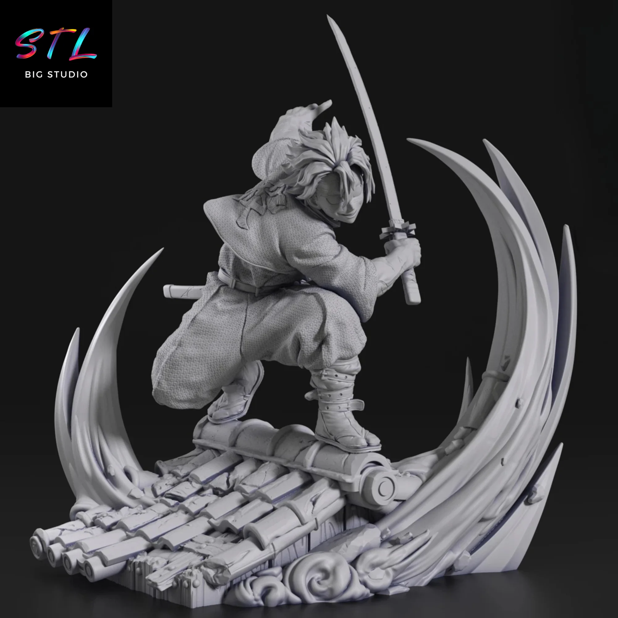 El diseño STL de Sanemi transmite su personalidad explosiva y su determinación inquebrantable frente a los demonios, con cada detalle de su atuendo, su espada Nichirin y las cicatrices que narran la dureza de su vida como hashira. La base, con efecto de corte y energía en espiral, potencia la sensación de poder y velocidad, como si Sanemi estuviera desgarrando el aire en ese mismo instante.