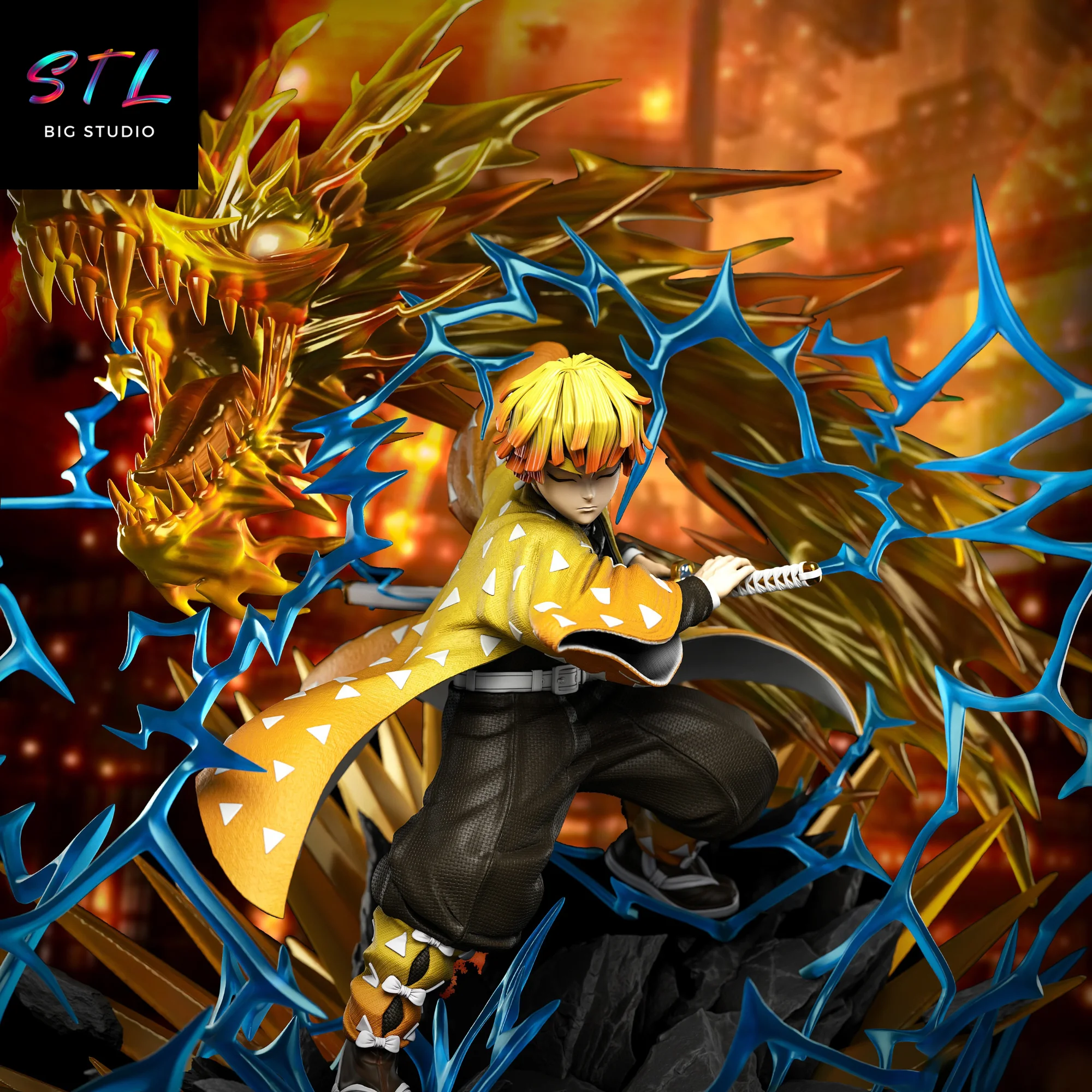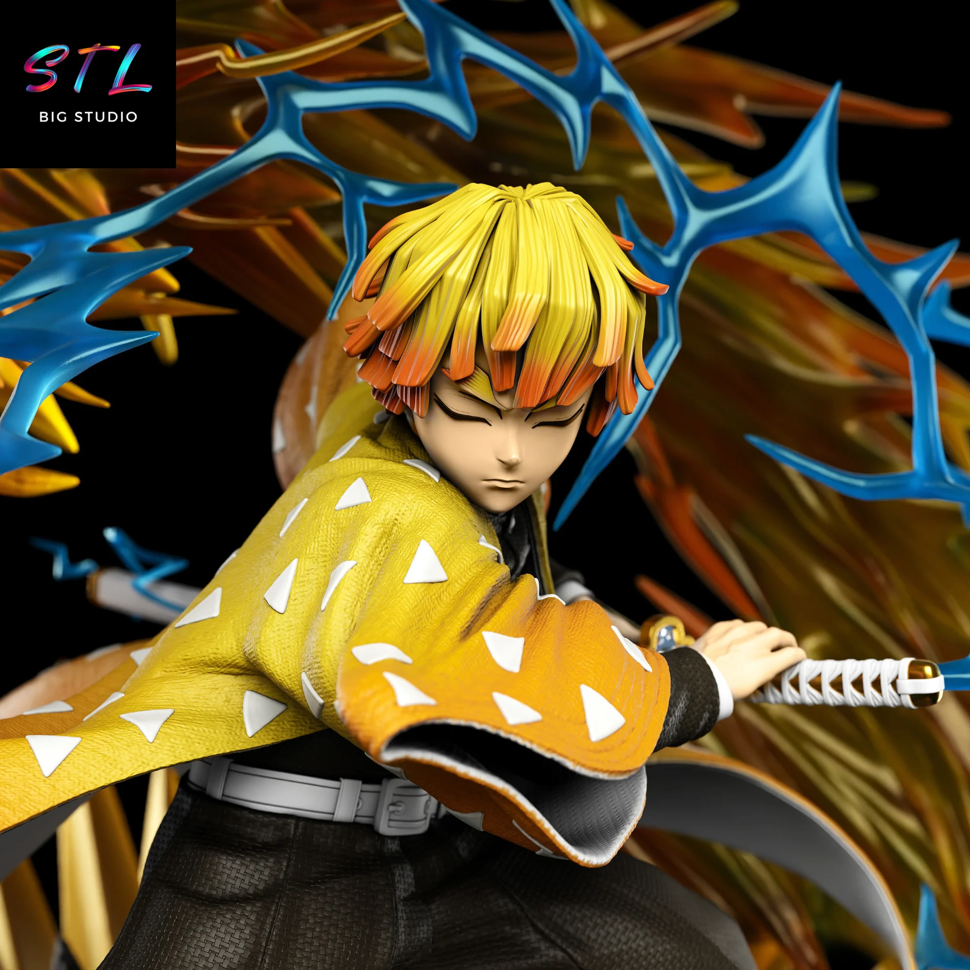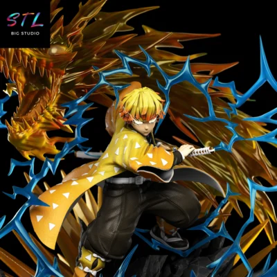 - Representación STL de Zenitsu Agatsuma en pose de ataque, con una composición cargada de movimiento.